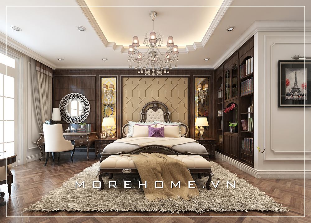 Thiết kế nội thất giường ngủ tân cổ điển chú trọng từng đường hoa văn điêu khắc vô cùng tinh xảo, điêu luyện mang đến sự sang trọng và đẳng cấp hơn cho không gian sống