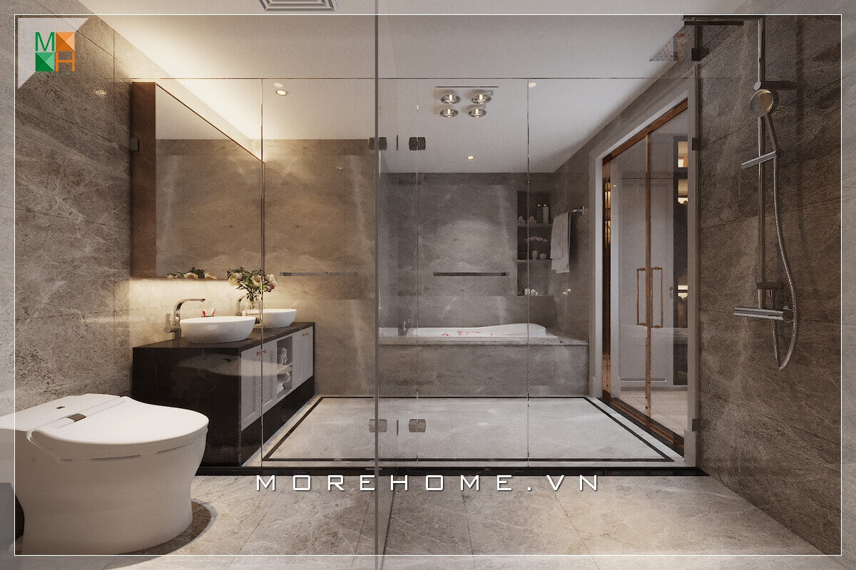 Nội thất phòng tắm biệt thự, nhà phố đẹp sang trọng có vách kính ngăn tiện lợi ấn tượng.