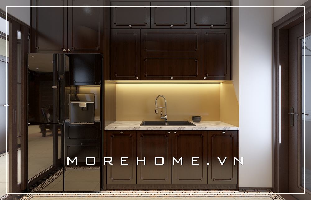 Thiết kế nội thất phòng bếp biệt thự tân cổ điển sử dụng tone màu trầm ấm cúng, sang trọng và đẳng cấp
