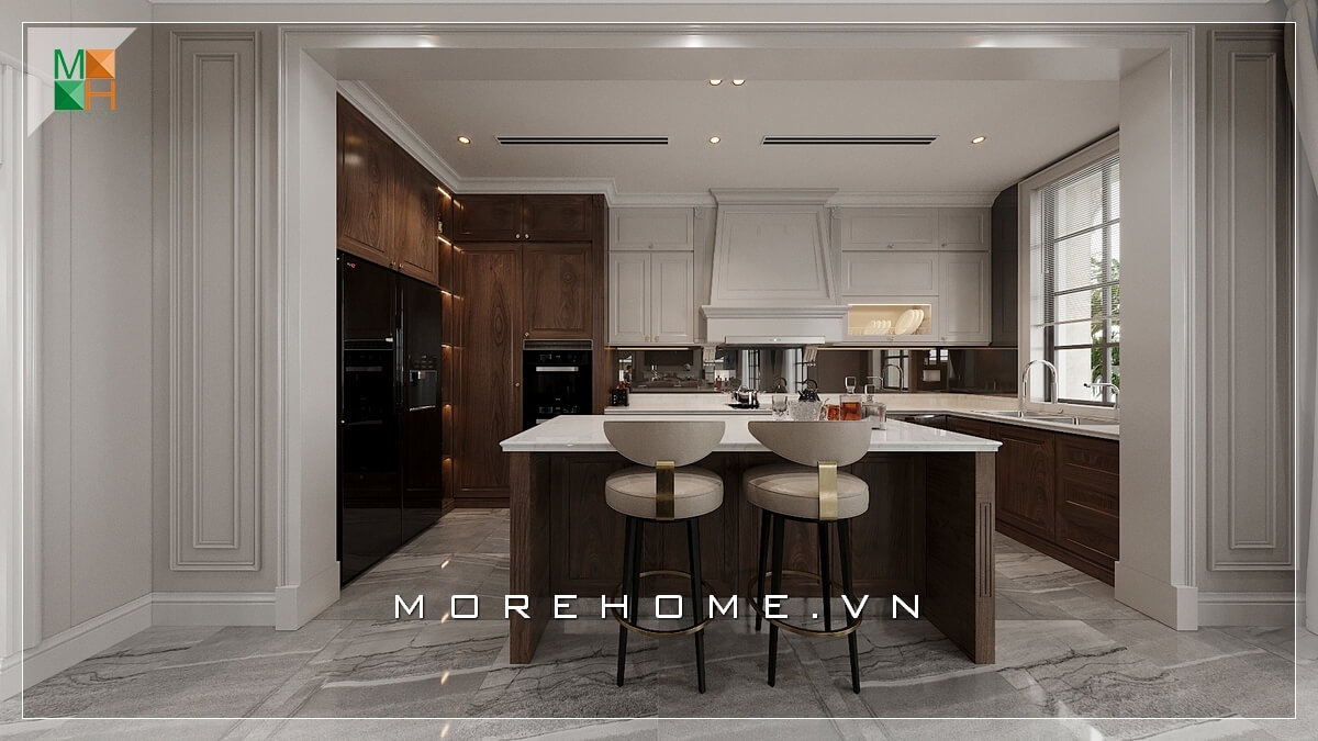 Thiết kế phòng bếp nhà phố với nội thất bố trí hiện đại có bàn đảo nhỏ giúp thuận tiện cho sinh hoạt của gia đình.