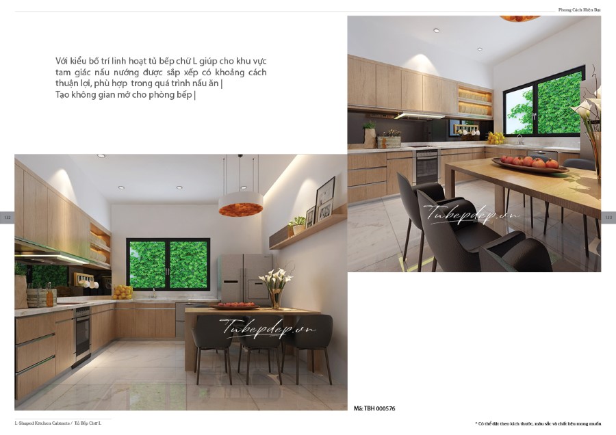 Mẫu tủ bếp gỗ tự nhiên tone màu trầm, thiết bị phòng bếp hiện đại tạo không gian ấm cúng và tiện nghi cho người nội trợ