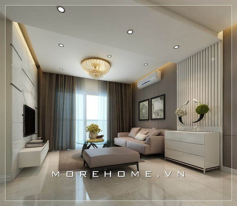 Thiết kế nội thất phòng khách chung cư hiện đại với gam màu nâu nhạt đầm ấm dễ chịu