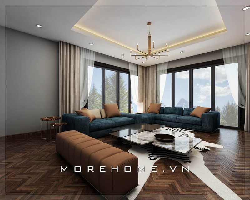 Mẫu thiết kế phòng khách biệt thự đẹp với những cánh cửa kính lớn kết hợp bộ sofa bọc nỉ cao cấp tạo nên một không gian thư giãn và tiếp khách tuyệt vời cho gia chủ