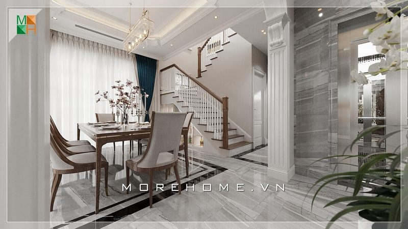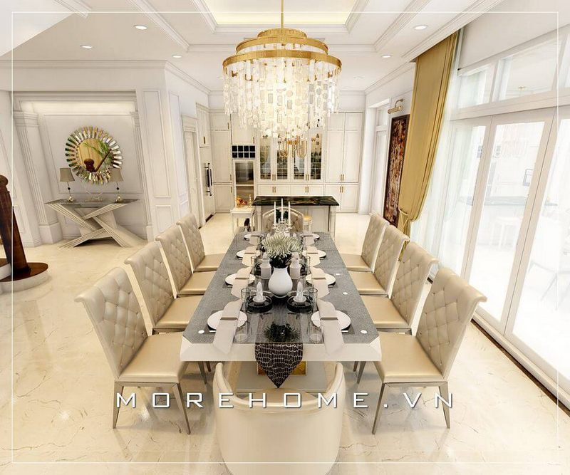 Tâm điểm của nội thất phòng ăn biệt thự, nhà phố là bộ bàn ghế ăn lớn bố trí theo kiểu hiện đại vừa sang trọng lại tiện nghi.