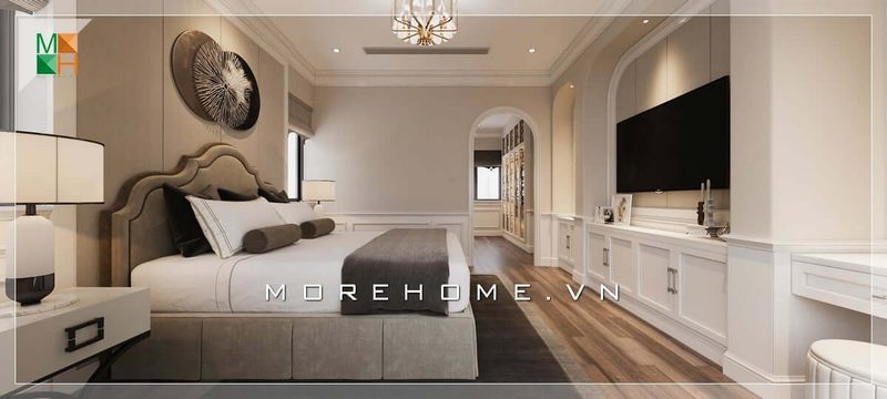 Mẫu thiết kế phòng ngủ tân cổ điển sang trọng với đồ nội thất gỗ tự nhiên mang đến cảm giác như một căn phòng ngủ hoàng gia đầy đẳng cấp