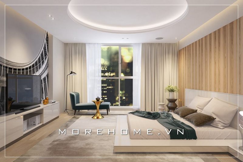 Bố trí nội thất phòng ngủ chung cư hiện đại, hợp lí từ giường ngủ, tap đầu giường, kệ tủ ti vi, bàn trang điểm... tất cả tạo nên một không gian nghỉ ngơi thoải mái mà không kém phần sang trọng
