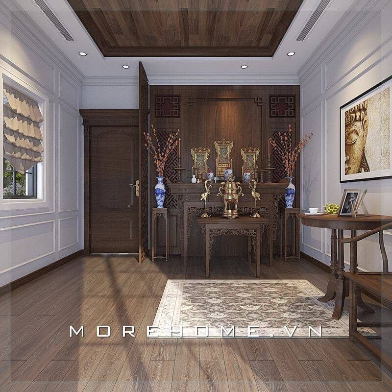Mang đến không gian thờ cúng cho nhà phố sang trọng với mẫu bàn thờ gỗ cao cấp kết hợp nội thất cùng tông màu nâu trầm tạo sự sang trọng và lôi cuốn