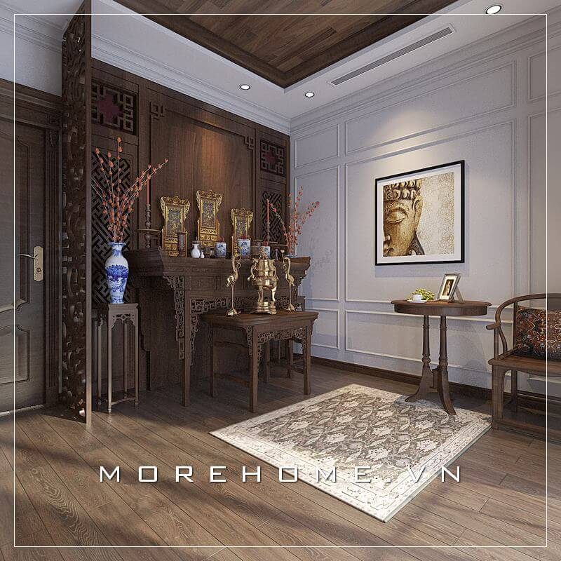 Vị trí bàn thờ chung cư, tủ thờ chung cư được thiết kế và thi công liền kề với không gian phòng khách. Morehome thi công hoàn thiện bàn thờ gia tiên hiện đại bằng gỗ tần bì nhập khẩu phun sơn màu cánh gián đẹp cho căn hộ chung cư Thăng Long Number One tại hà nội