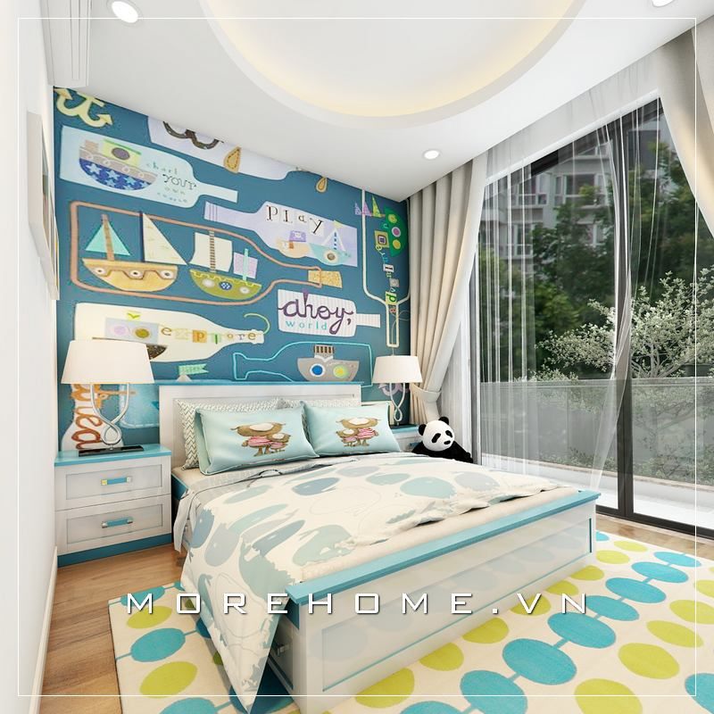 Giường ngủ trẻ em gỗ công nghiệp, sự kết hợp hoàn hảo giữa 2 gam màu xanh - trắng tạo sự nổi bật cho cả căn phòng