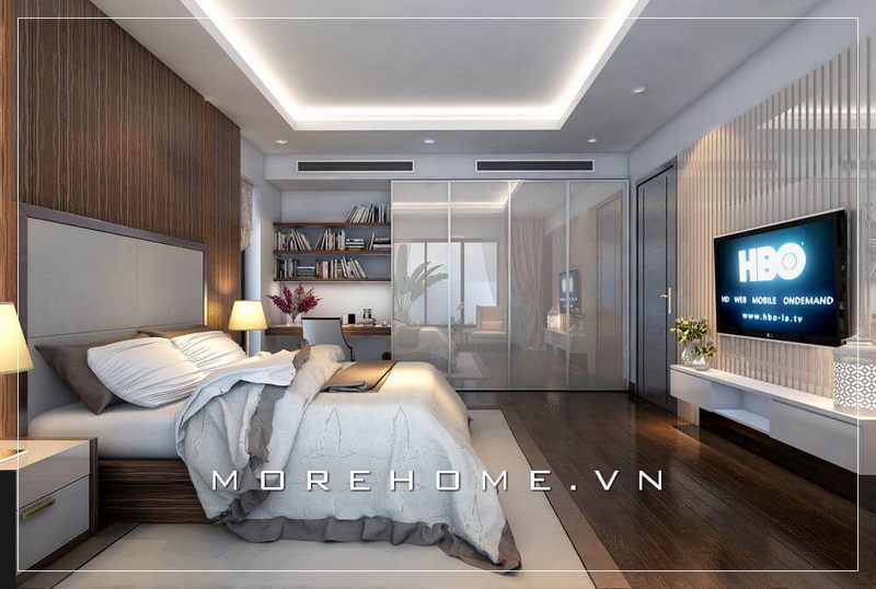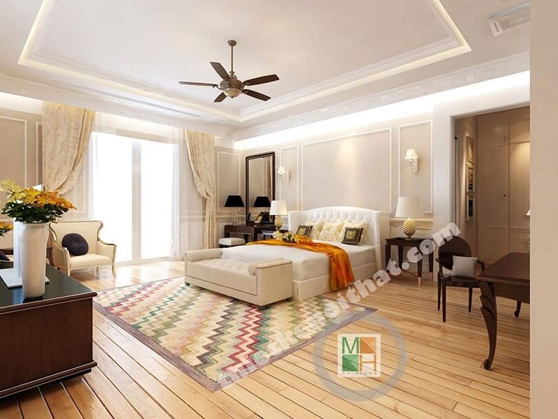 Thiết kế nội thất phòng ngủ gỗ công nghiệp nhẹ nhàng kết hợp tone màu trắng chủ đạo mang lại không gian nghỉ ngơi yên tĩnh mà không kém phần sang trọng