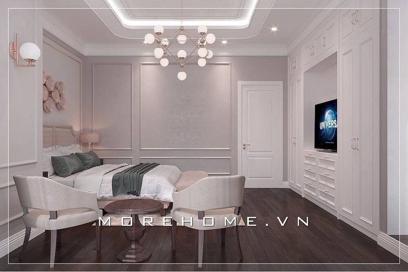 Một không gian phòng ngủ thiết kế kết hợp độc đáo giữa hai phong cách hiện đại và tân cổ điển, tinh tế sang trọng phù hợp cho chung cư, nhà phố, biệt thự.