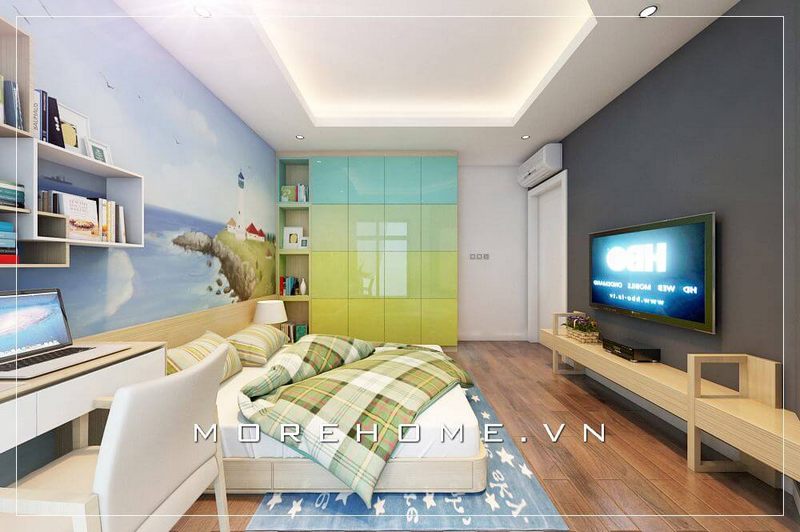 Kệ gỗ công nghiệp hiện đại đầy ấn tượng tích hợp của nhiều công năng như kệ ti vi, kệ trang trí... tiện nghi cho không gian phòng ngủ của con