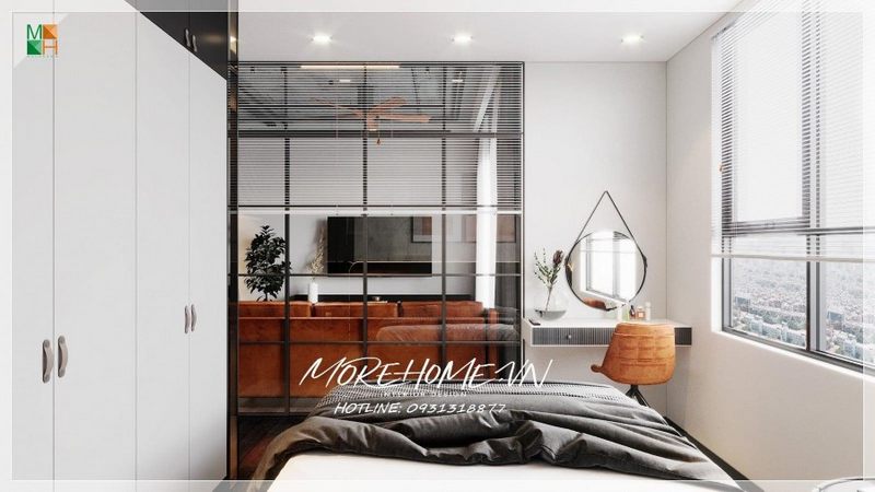 Một chiếc giường diện tích vừa phải, tủ màu trắng rộng rãi để được nhiều quần áo để đồ dùng cá nhân của gia chủ trong phòng ngủ thuận lợi.