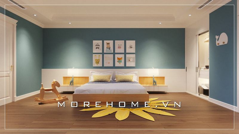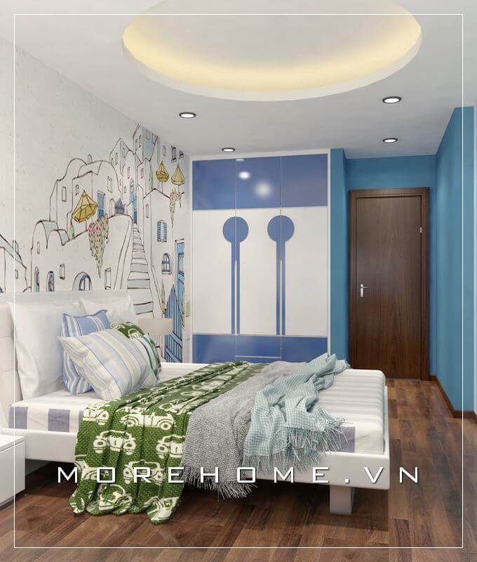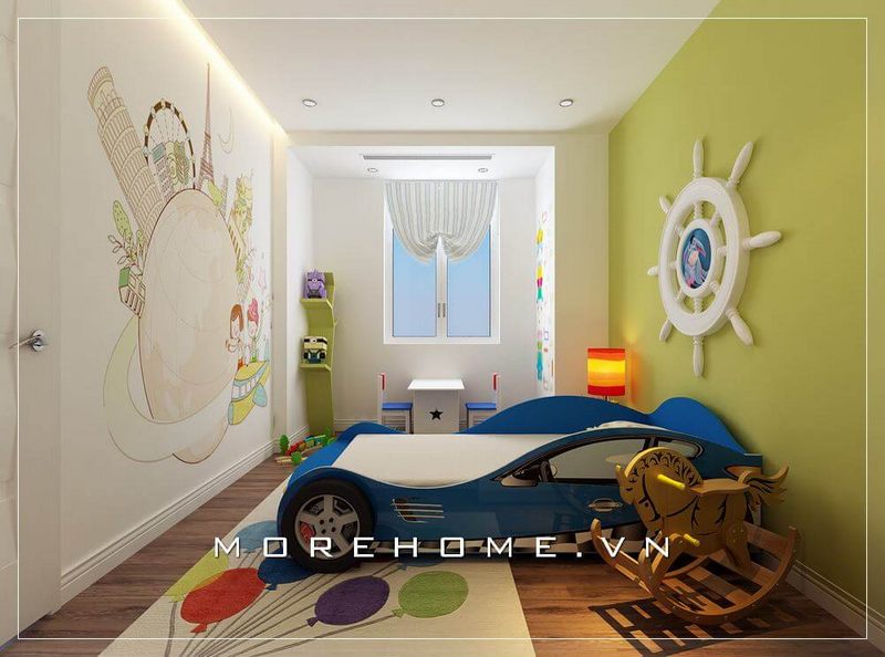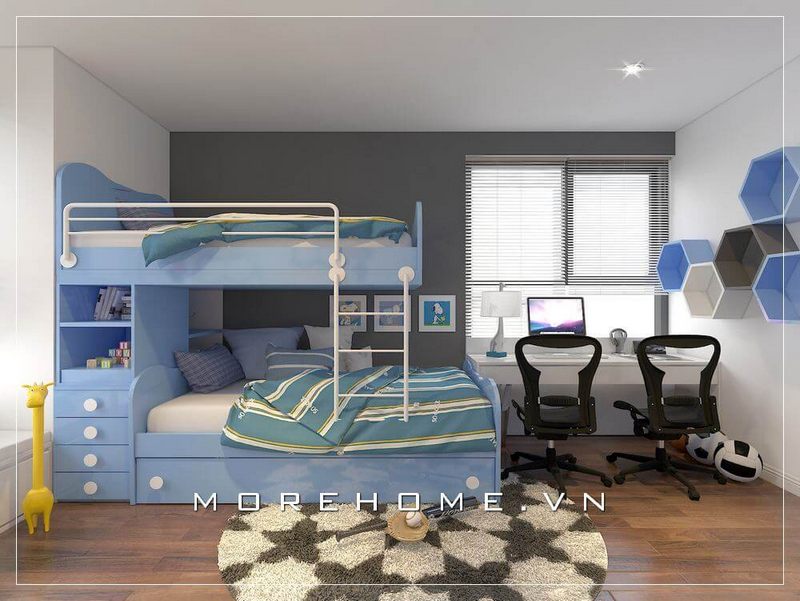 Thiết kế giường ngủ bé trai hiện đại, tone màu xanh chủ đạo cùng kiểu dáng độc đáo phù hợp với sở thích của bé