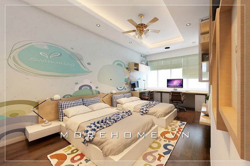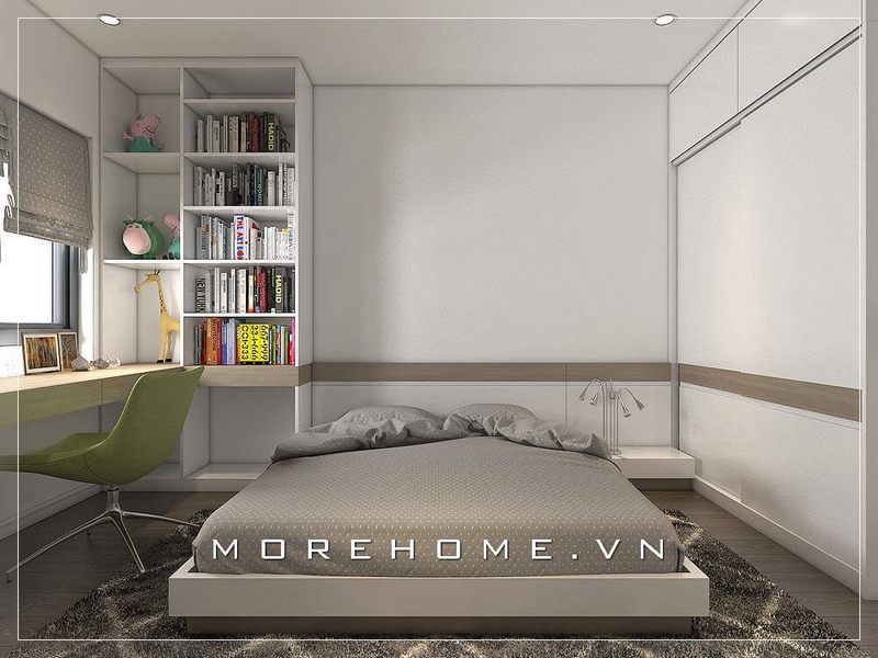 Thiết kế giường ngủ trẻ em hiện đại đầy ấn tượng, KTS khéo léo lồng ghép kết hợp với tủ kệ, bàn học, tab đầu giường cùng chất liệu tạo cho không gian thêm rộng thoáng và tiện nghi
