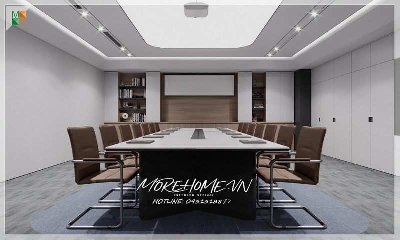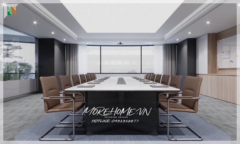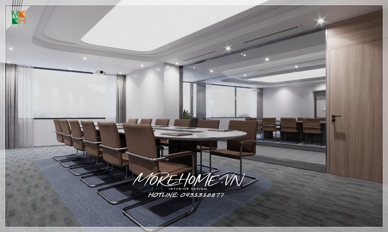 Bộ bàn ghế văn phòng được đặt vị trí chính giữa giúp không gian phòng họp trở nên đẹp và ân tượng hơn.
