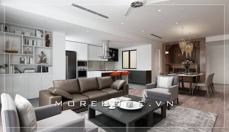 Mẫu thiết kế nội thất chung cư đẹp, nổi bật với bộ sofa da cao cấp cùng cách sắp xếp nội thất khoa học mang đến sự thông thoáng cho không gian sống của căn nhà