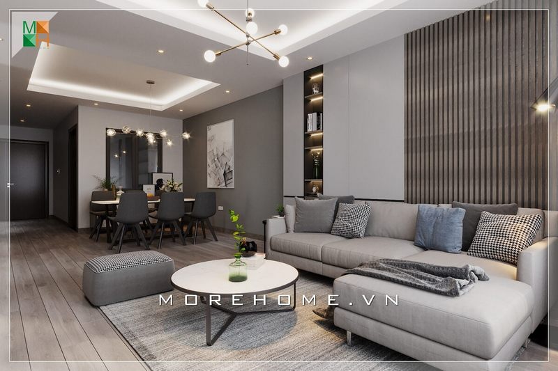 Phòng khách chung cư ấn tượng với sofa dáng góc hiện đại bọc vải màu ghi nhẹ nhàng, ấm cúng.