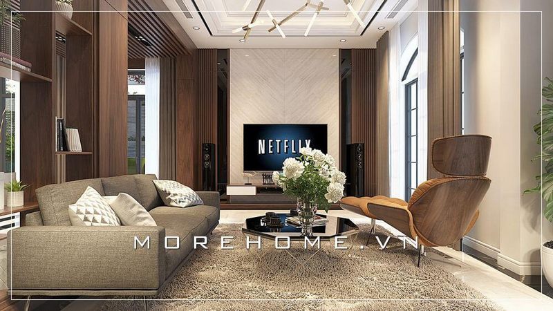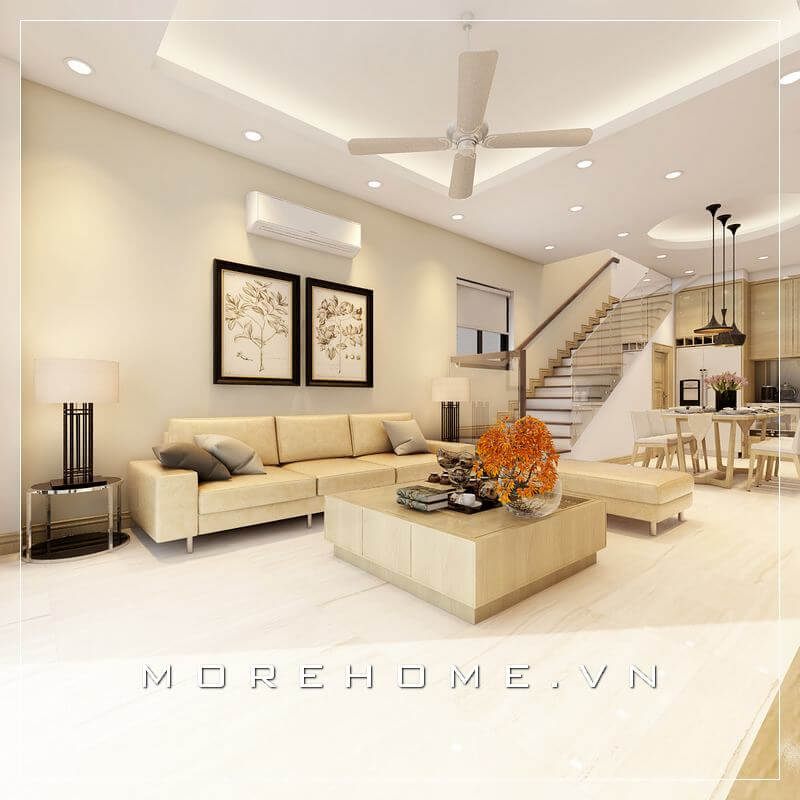 Thiết kế nội thất phòng khách hiện đại với mẫu sofa bọc vải là điểm nhấn của căn phòng