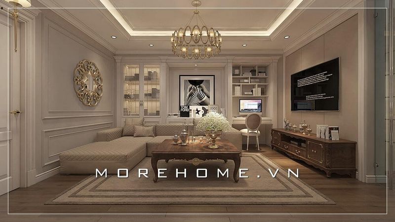 Phòng khách chung cư sang trọng, đẳng cấp với tâm điểm là thiết kế sofa tân cổ điển từ gỗ tự nhiên độc đáo và đệm bọc da màu trắng tinh tế.