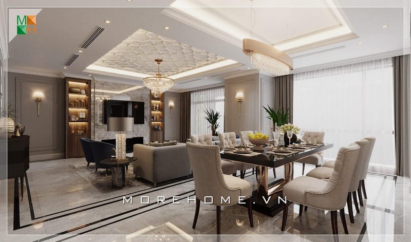 Thiết kế nội thất phòng ăn mang phong cách tân cổ điển đẹp và sang trọng. Bộ ghế bọc sofa đầy sức hút