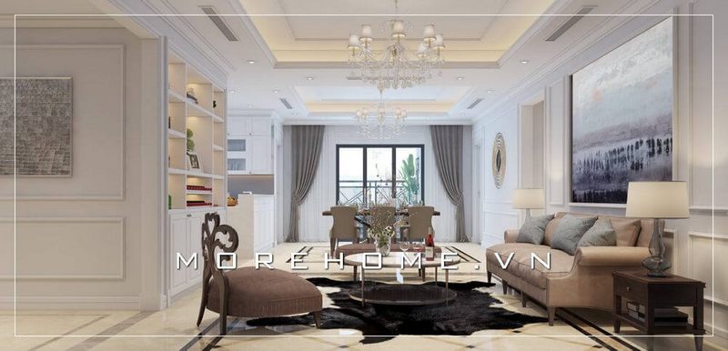 Phòng khách chung cư ấn tượng và nổi bật hơn với chiếc kệ ti vi tân cổ điển tích hợp kệ decor trang trí