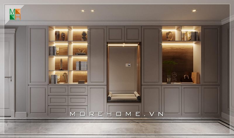Lối thiết kế nội thất biệt thự, nhà phố. chung cư thông minh và tận dụng diện tích hành lang để thiết kế kệ tủ đồ gỗ cao cấp âm tường hiện đại và sang trọng có tính thẩm mỹ cao.