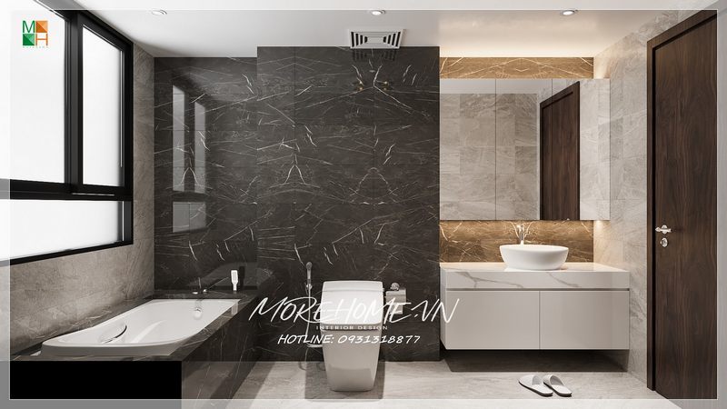 Trang trí phòng tắm có bồn tắm với phong cách hiện đại nội thất tối giản nhưng không kém phần tiện nghi cho quá trình sử dụng sinh hoạt hằng ngày của gia chủ.