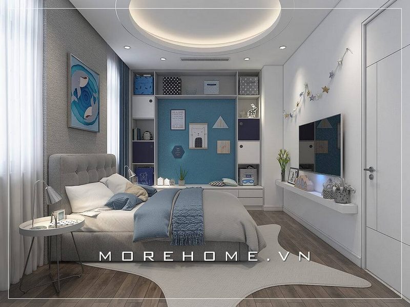 Mẫu kệ trang trí gỗ công nghiệp được thiết kế âm tường, ô tủ tạo nên sự đa năng và hiện đại đẹp cho phòng ngủ của bé trai