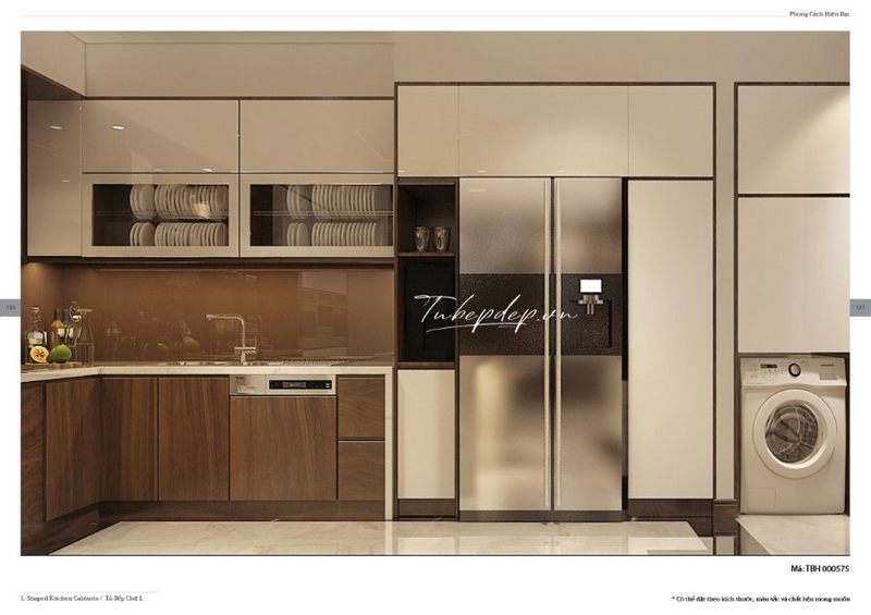 Kết hợp cả chất liệu acrylic bóng sáng cho tủ bếp trên với tủ bếp dưới laminate tạo nên sắc màu ấn tượng và sự mới mẻ cho không gian nội trợ