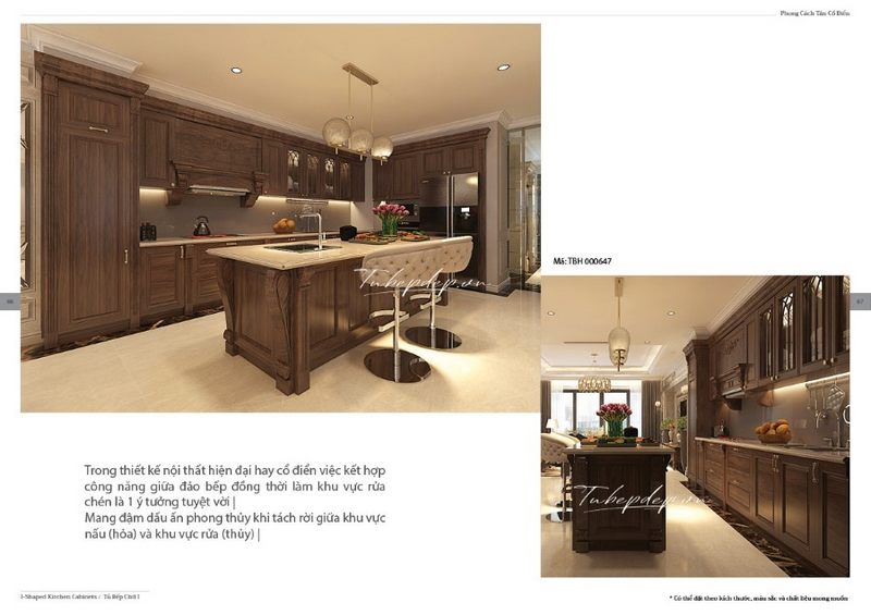 Tư vấn bố trí nội thất phòng bếp với 2 bên tủ phân chia khu nấu và rửa song song tiện lợi và mang yếu tố phong thủy tốt
