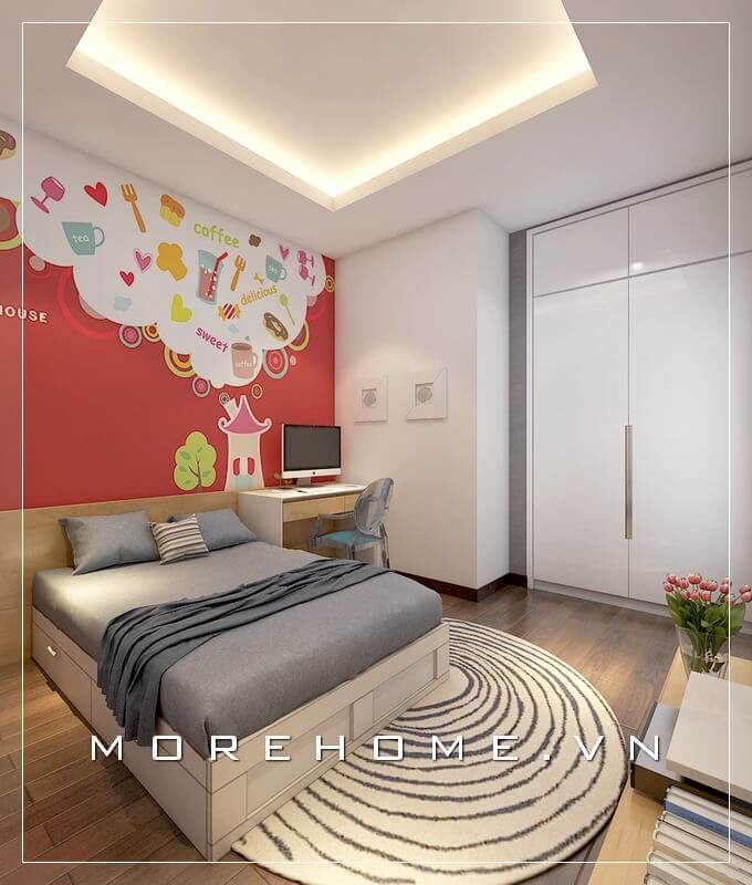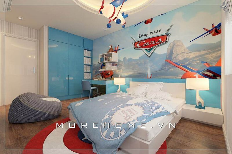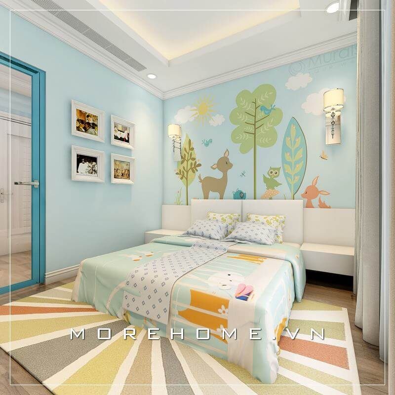Morehome đề xuất một số mẫu thiết kế phòng ngủ kết hợp tranh dán tường có màu xanh tối, giúp tối ưu diện tích và tạo nên không gian mở rộng rãi và hiện đại.