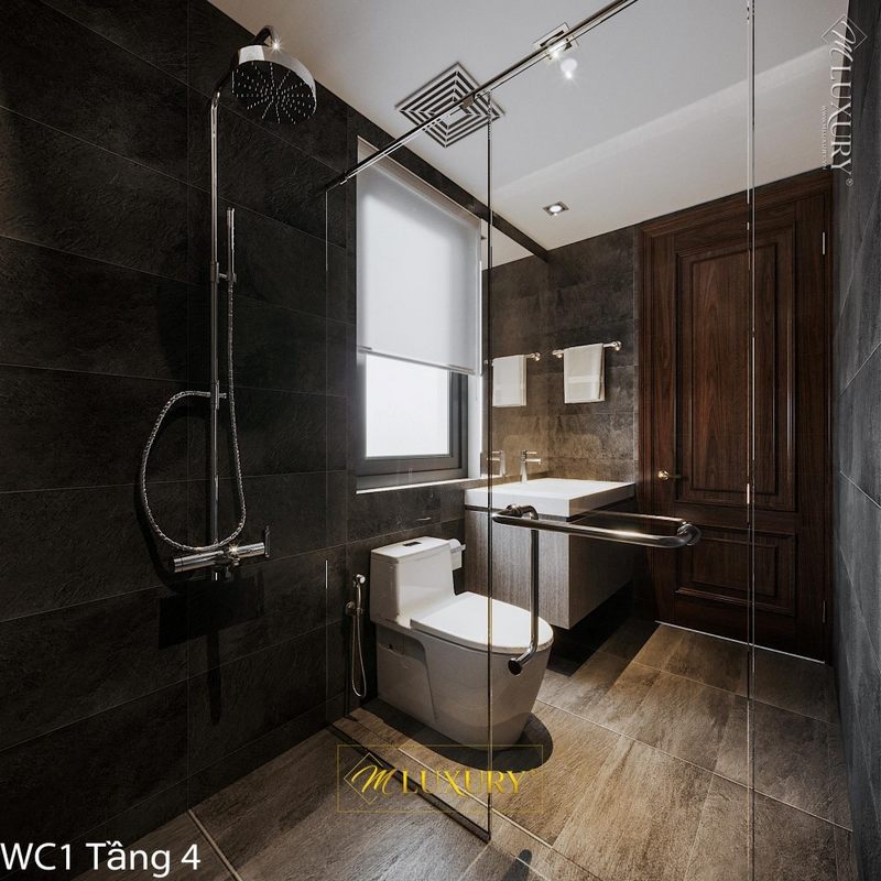 Không gian phòng tắm được thiết kế với gam màu trầm và nội thất hiện đại, tạo nên một không gian sử dụng tiện nghi và đẹp mắt.