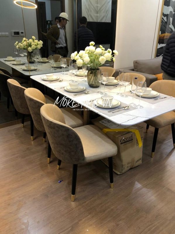 Ghế ăn bằng gỗ tự nhiên bọc nỉ màu be có kiểu dáng nhỏ gọn, phù hợp với phong cách hiện đại của phòng ăn chung cư, nhà phố.